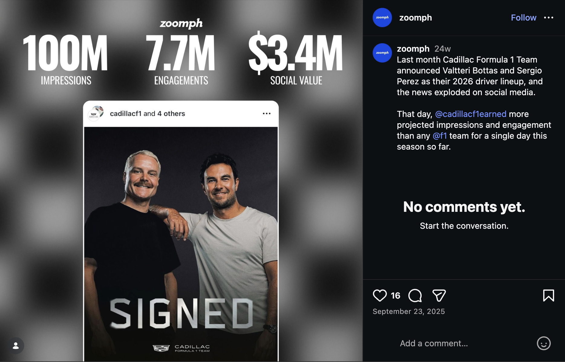 Within the first six months of the team being announced for the 2026 grid, the Cadillac Formula 1 Team had the fastest-growing fan base of any Formula 1 team.